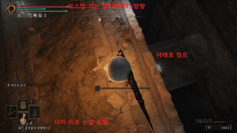 로밍하는 바실리스크 눈알이 있는 다리에서 직진하면, 보스방으로 내려가는 엘베가 있고 가기 전에 다리 중간에서 잘 보고 아래로 낙하하자. (고룡 기사의 제작서가 필요없으면 직진해서 보스 잡자) 낙하하면 임프가 반겨주니 주의