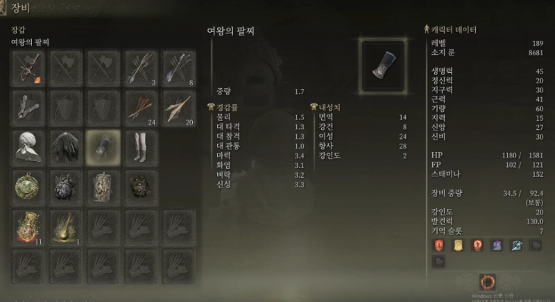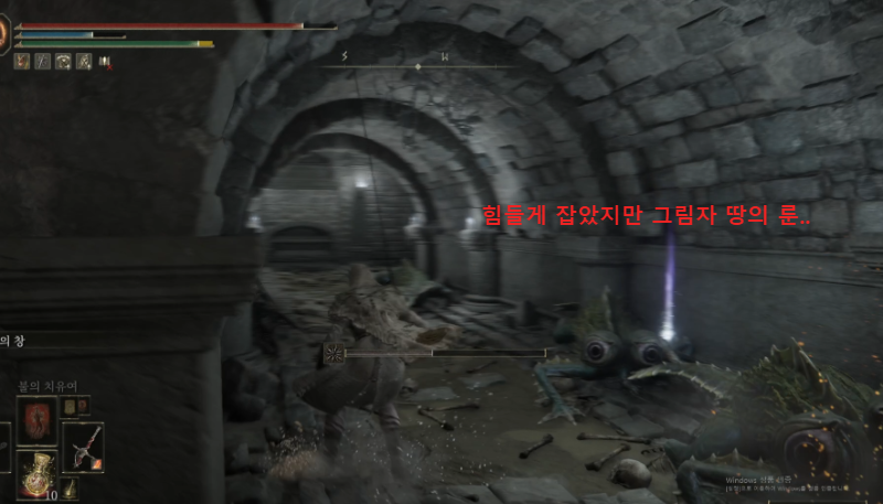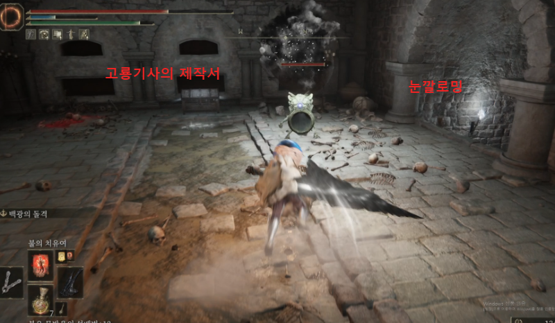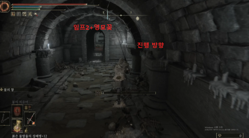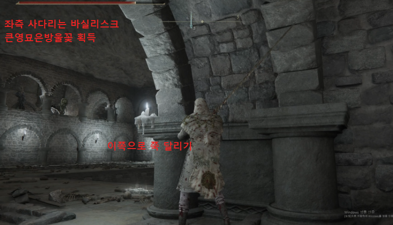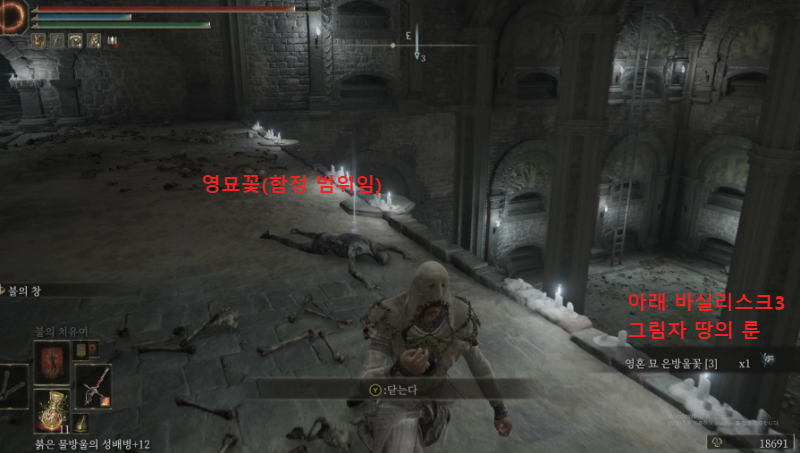 함정 건너편에, 영묘꽃 잡템이 떨어져 있는데 함정 범위니 조심해서 루팅하고 사다리 쪽으로 떨어지자. 그림자 땅의 룬 말고 먹을 거 없으니 기사 셋쪽 방으로 진행해도 무방하다.