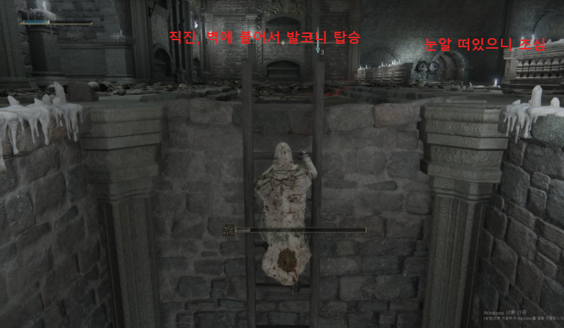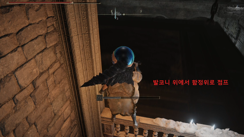 정면 벽에 붙어서 발코니에서 함정을 타고 올라가자.
