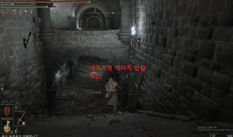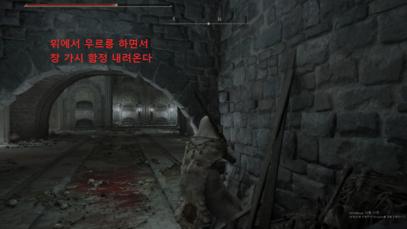 몹 무시하고 쭉 달려가서 즉사게이지가 올라가지않는 복도에서 임프를 정리하자. 그상태로 진행한다. 길은 단순한 일방 통행+잡템만 주다가, 아래처럼 확 넓어진, 위에서 쇠못판이 떨어지는 함정이 나오는 방이 나온다.