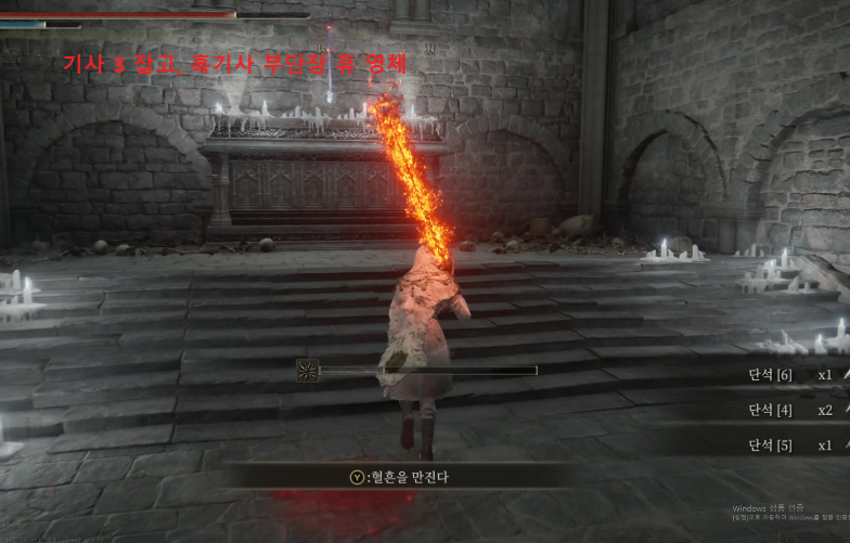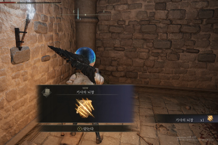 사다리로 올라가면, 다음 층으로 진행되니 일단 미루고, 사다리쪽에서 함정 한번 기다렸다가 기사 3마리를 정리하면, 흑기사 부단장 휴 영체를 획득 할 수 있다. 중간 놈은 뒤돌아있으니 양옆부터 정리하자.