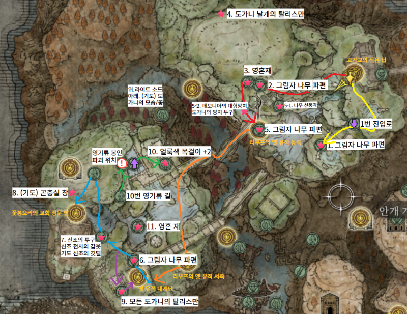 6. 그림자 나무 파편: 주황색 선을 따라 이동한다. 중간에 다리가 끊어져 있는건 우측으로 점프하면 되며, 불거인이 전방으로 광선 쏘는거 맞으면 죽으니 조심하자. 주황색 선 따라서 라우프의 옛 유적 서쪽 축복을 찍고 건물 내부로 진입해서 건물 중앙의 단상에서 루팅할 수 있다. 근처에 쌍칼새 있으니 주의 또 주의..