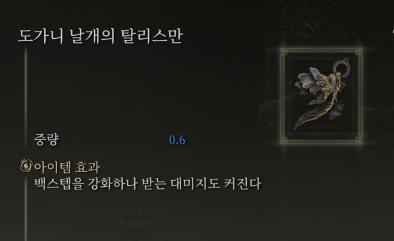 4. 도가니 날개의 탈리스만: 그림자 나무 파편을 먹고, 영기류 쪽으로 정확히 점프하면 지하로 갈 수 있다. 지하로 가서 파리 많은 데 중 나무가 위로 솟아 있는데에서 루팅 (백스탭의 능력을 강화하나 받는 데미지가 늘어난다)