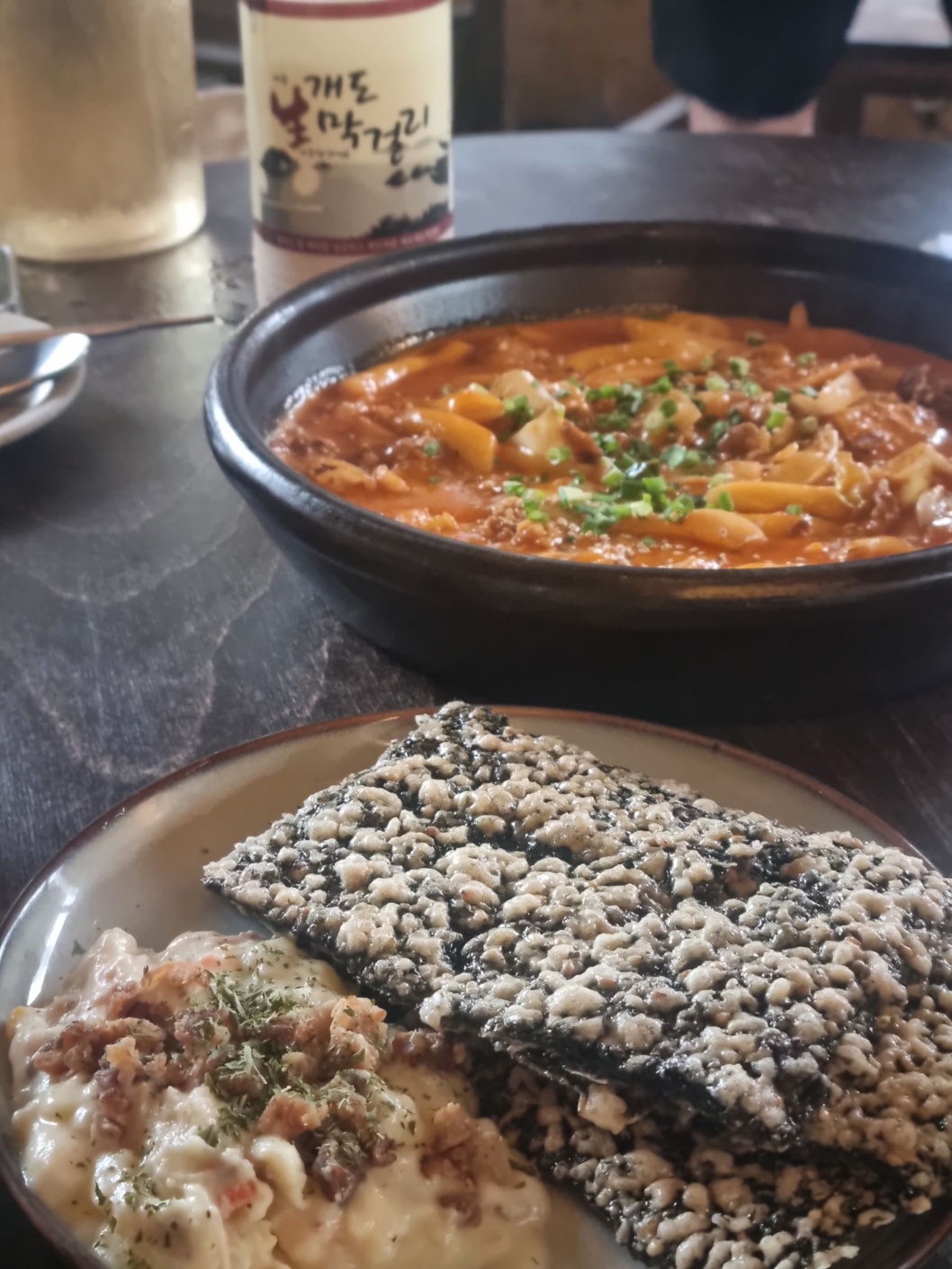 먹은 메뉴: 우삼겹고추장크림떡볶이 (22000원), 김부각과 감자샐러드 (14000원) 개도막걸리(6000원)