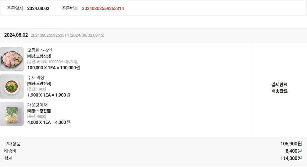 이번에 4~5인 10만원짜리 주문했고, 매운탕 야채, 수제 막장 추가하고 이코노미 퀵비까지 114,300원이 나왔다. (여기서 주소를 입력하면 퀵비 미리 확인할 수 있다.)