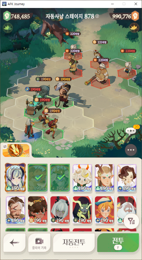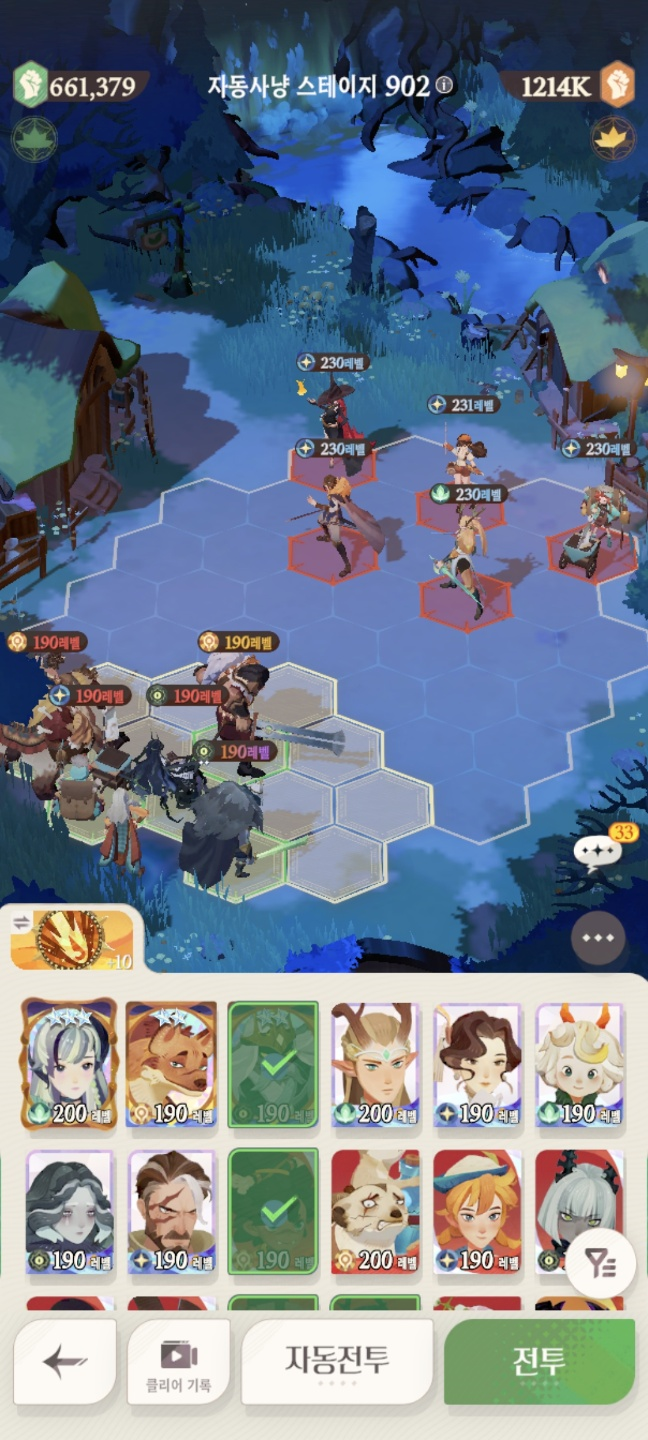 한번 렙업하면 막힐때까지 쭉 밀었으므로 대충 난이도 구간 파악도 가능할 거라 생각한다. 최다 5번정도 트라이 내에 성공한 조합들이다. 하다 막히면 메아리/주 딜러 장비도 꼭!! 변경/업그레이드하자 (내 탱이 약하면 탱메아리.. 딜이 약하면 딜메아리 등으로 응용): 내 전투력 수치랑 비교해 봐도 장비 업글 정도를 파악할 수 있을 것이다.