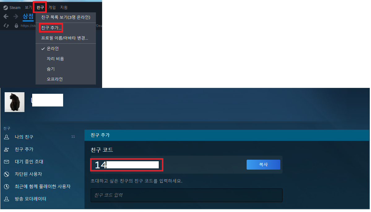 스팀번호는 스팀에서 친구 > 친구 추가에서 확인할 수 있다.