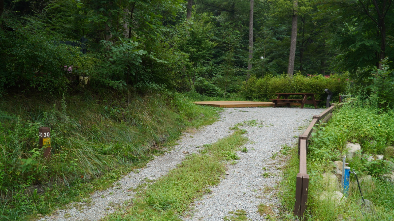 31번데크는 이렇게 약간 경사에 차를 주차해야 한다. 경사위에 사이트가 올라가 있어서 다른 사이트 보다 더 프라이빗한 느낌이 있어서 더 좋았다. 화장실/샤워실/개수대가 가깝고 프라이빗한 명당 사이트라고 생각했다.