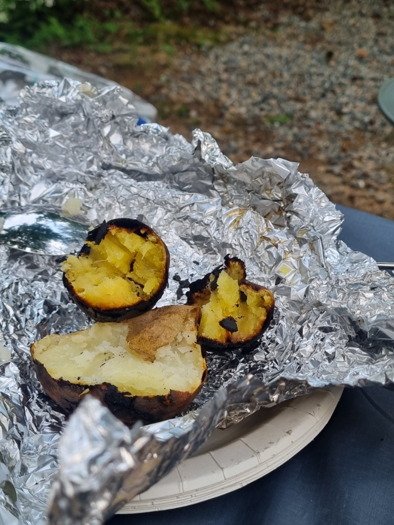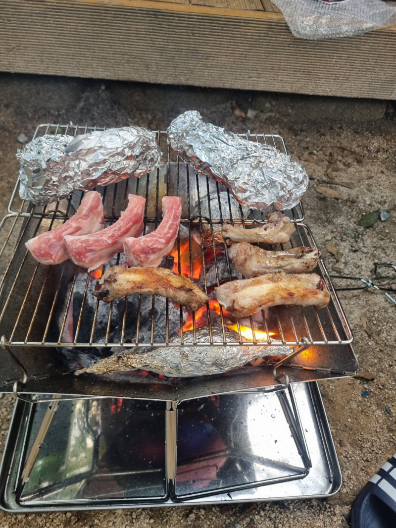 돼지 등갈비 구워먹었는데 개꿀맛.. 호일에 싼건 그릴 위에 있는건 송이버섯 통구이, 밑에 있는건 고구마다