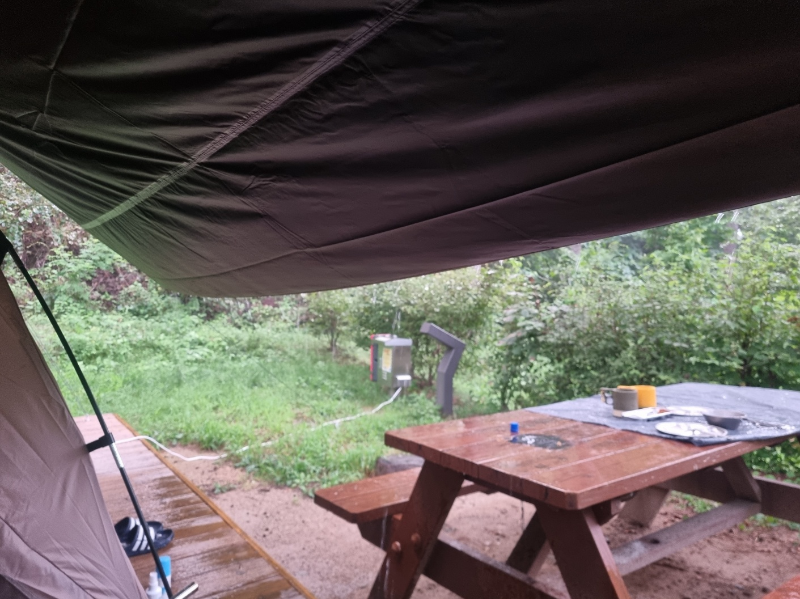 이 날 예상치 못하게 비가 엄청 많이 와서 타프 안쳤으면 정말 큰일날뻔했다; 플라이도 없는 텐트여서 말이지..