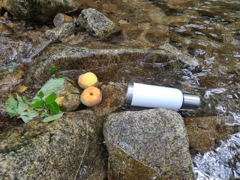 화천 숲속 야영장의 자랑 계곡으로 들어갔다~ (데크에 오징어팩으로 설치하였다!) 사온 맥주랑 과일 찹찹하며 더위를 식혔다.