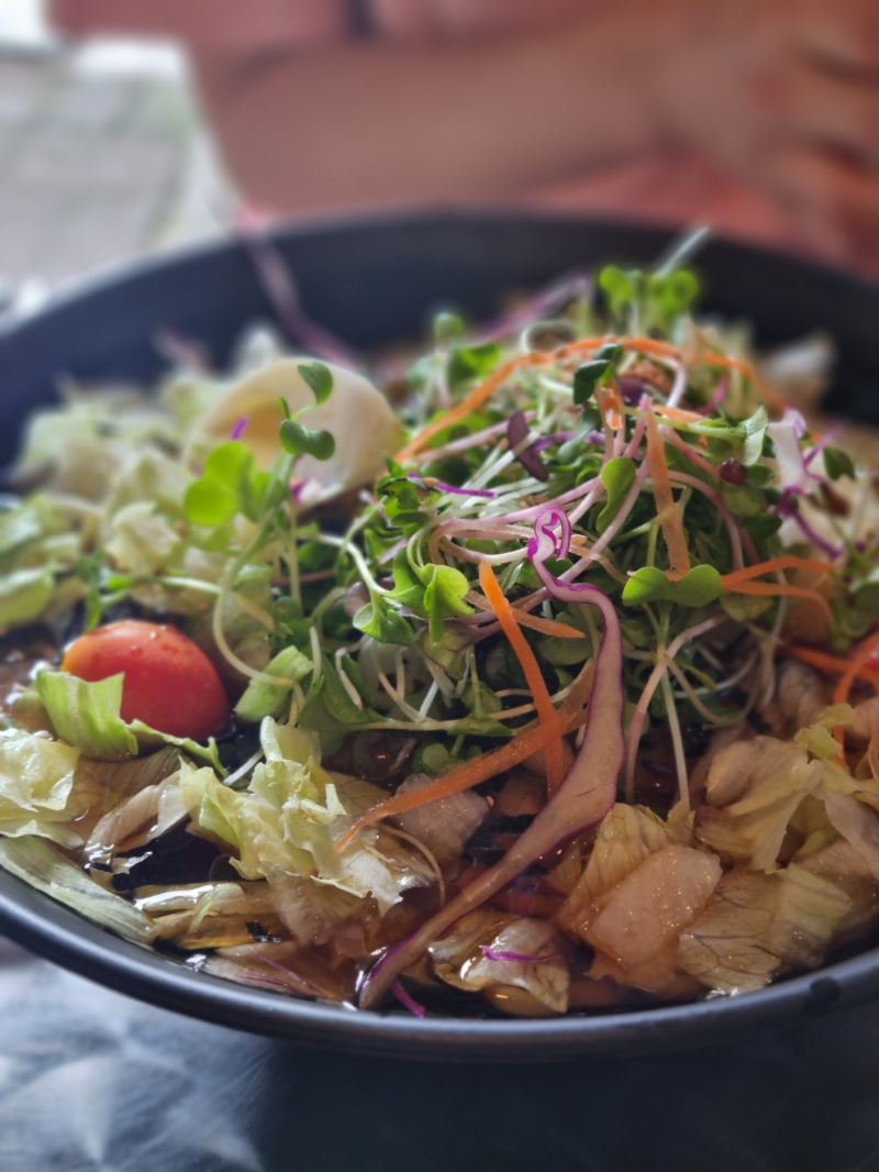 냉우동은 가쓰오부시 국물이다. 무 간것과 와사비 넣어서 맛있게 먹자.. 풍성한 야채 아삭아삭.. 더운데 살얼음 동동 떠있는 육수 마시면 기분이 아주 좋다. 새싹채소도 들어있어서 기분이 싱그럽다.