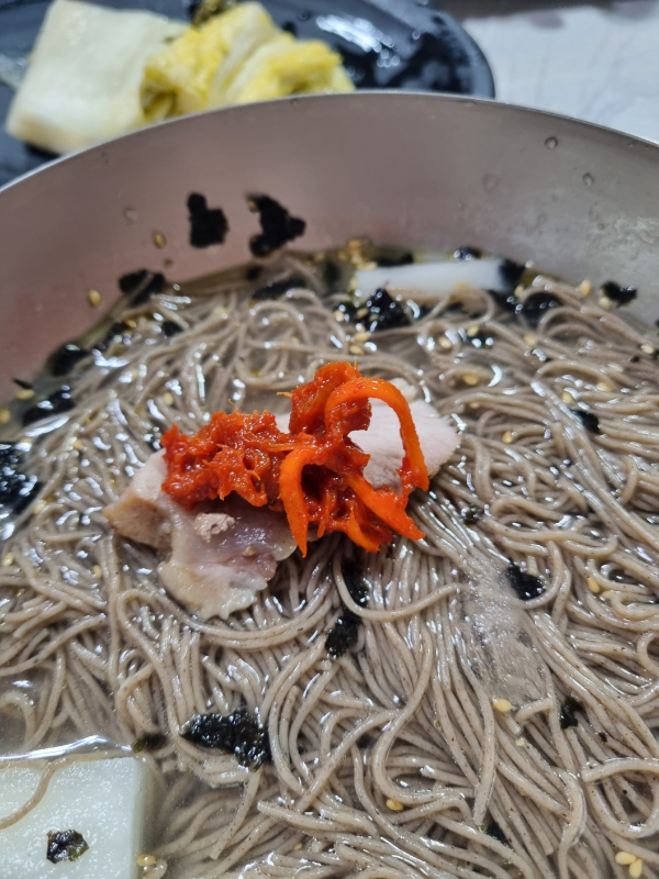 동치미국물을 면에 가득 붓고, 들기름 두바퀴정도 둘러 먹는게 제일 깔끔하고 맛있었다. 그 외 식초나 겨자, 설탕은 취향껏 넣어서 먹으면 된다. 들기름 막국수로 먹어도 메밀향이 향긋하고 너무 맛있다. 시원하고 달달한 동치미 국물과 들기름의 고소한맛 향긋한 메밀이 입안에서 폭발적으로 터지는 즐거움이 있었다.