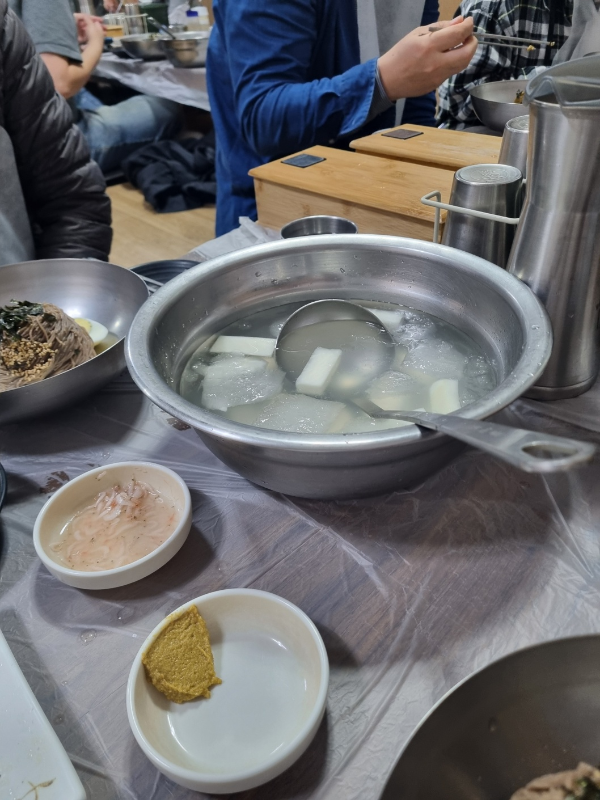 동치미 국물을 각자 퍼먹을 수 있게 대접에 담아 주시는데 이 동치미국물이 진짜 시원하고 맛있다. 안에 들은 동치미 무도 정말 맛있는데, 동치미 무좀 많이 넣어주시징.. 힝.. 김치 명인이야. 동치미 국물이 진짜진짜 사기다! 사기야!