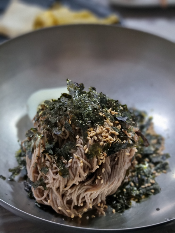 면을 호록 해보면 얇은 면이 뚝뚝 끊기는데 메밀 향이 미쳤다. 여기는 면에 김가루만 뿌려서 나와서 나머지는 손님이 조합해서 먹는 방식이다.