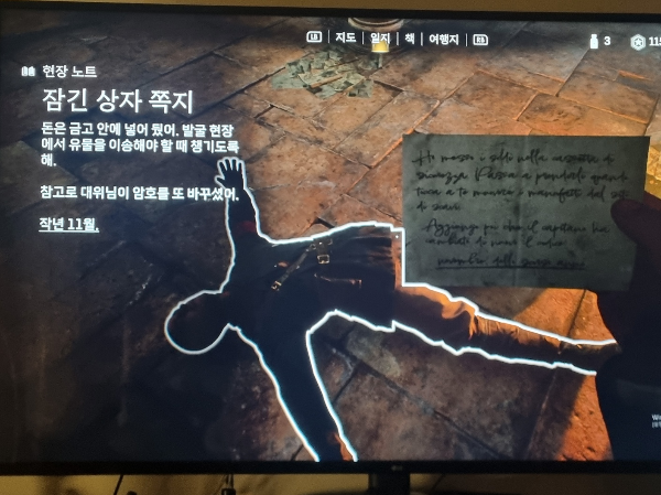 해당 쪽지에 심플하게 비밀번호가 적혀있어서 이를 입력하면 끝. 꽤 많은 돈과 쪽지 하나를 더 얻을 수 있다.