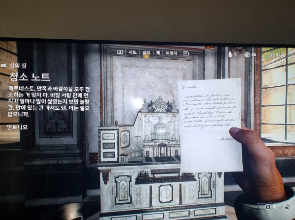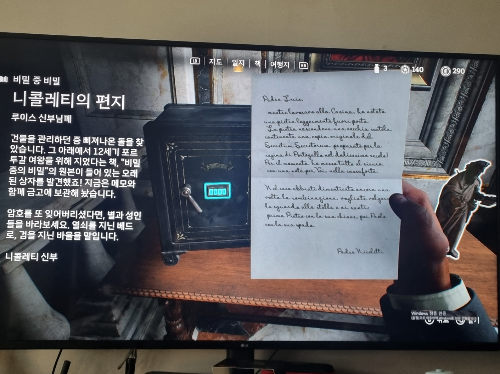방 좌측에 비밀번호 상자가 있고, 우측에 미스터리 쪽지(니콜레티의 편지)를 확인하면 힌트가 적혀있다.