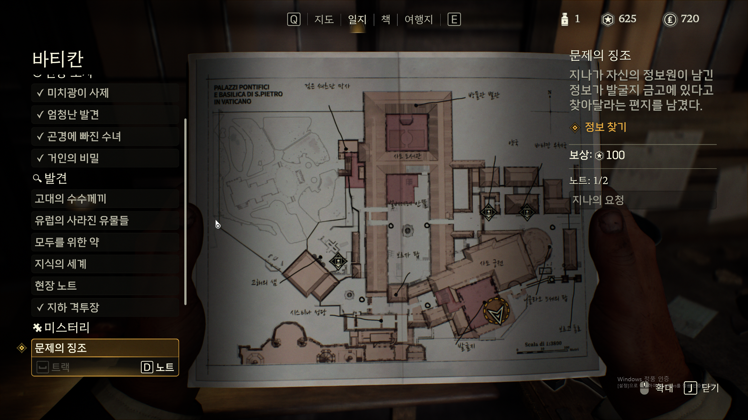 해당 미스터리 쪽지는 시스티나 성당 촛불 사이 책에 껴져있다.(잘 안보임) 해당 쪽지 없이 발굴지에 가도 금고는 존재했다.
