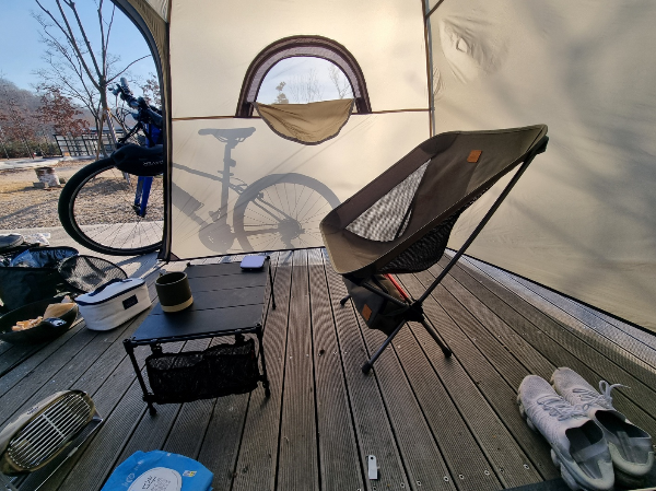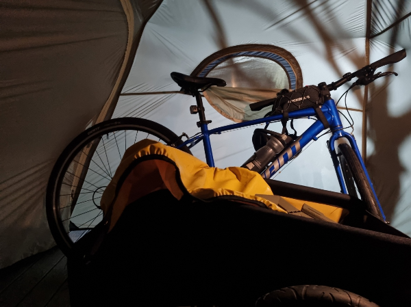 자기 전에 트레일러랑 자전거를 쉘터 안에 넣어놓고 꿀잠잤다.