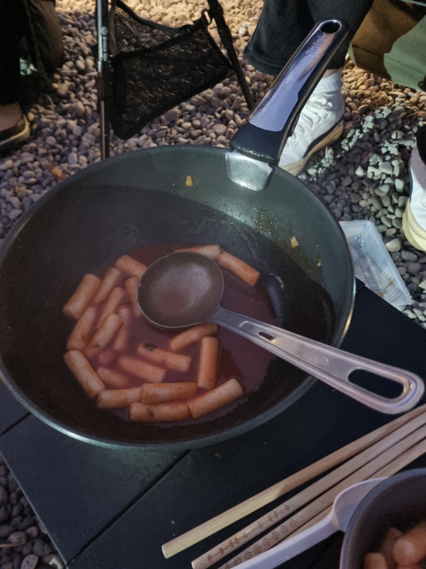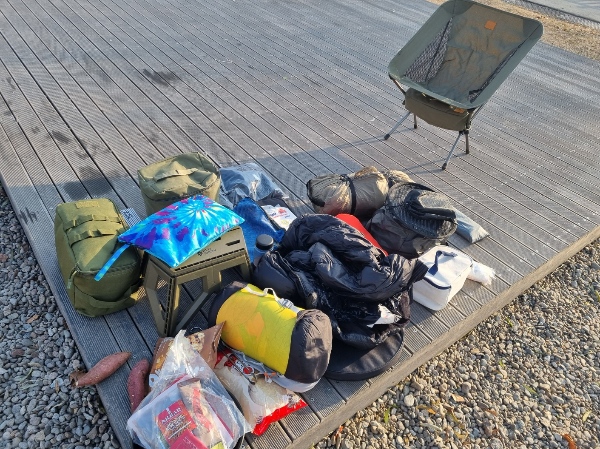 - 장비: 의자 2개, 테이블 2개, 침낭, 자충매트, 멀티탭, 미니 난로(툴콘), 텐트, 우모 패딩, 식기 w/설거지통, XD-2F(버너), 버너스탠드, 가스통2개, 토치, 토치용가스통1개, 냄비 개큰거(테팔매직핸즈), 티타늄 냄비 작은거, 화로대, 조명(크레모아 미니, 도킵)