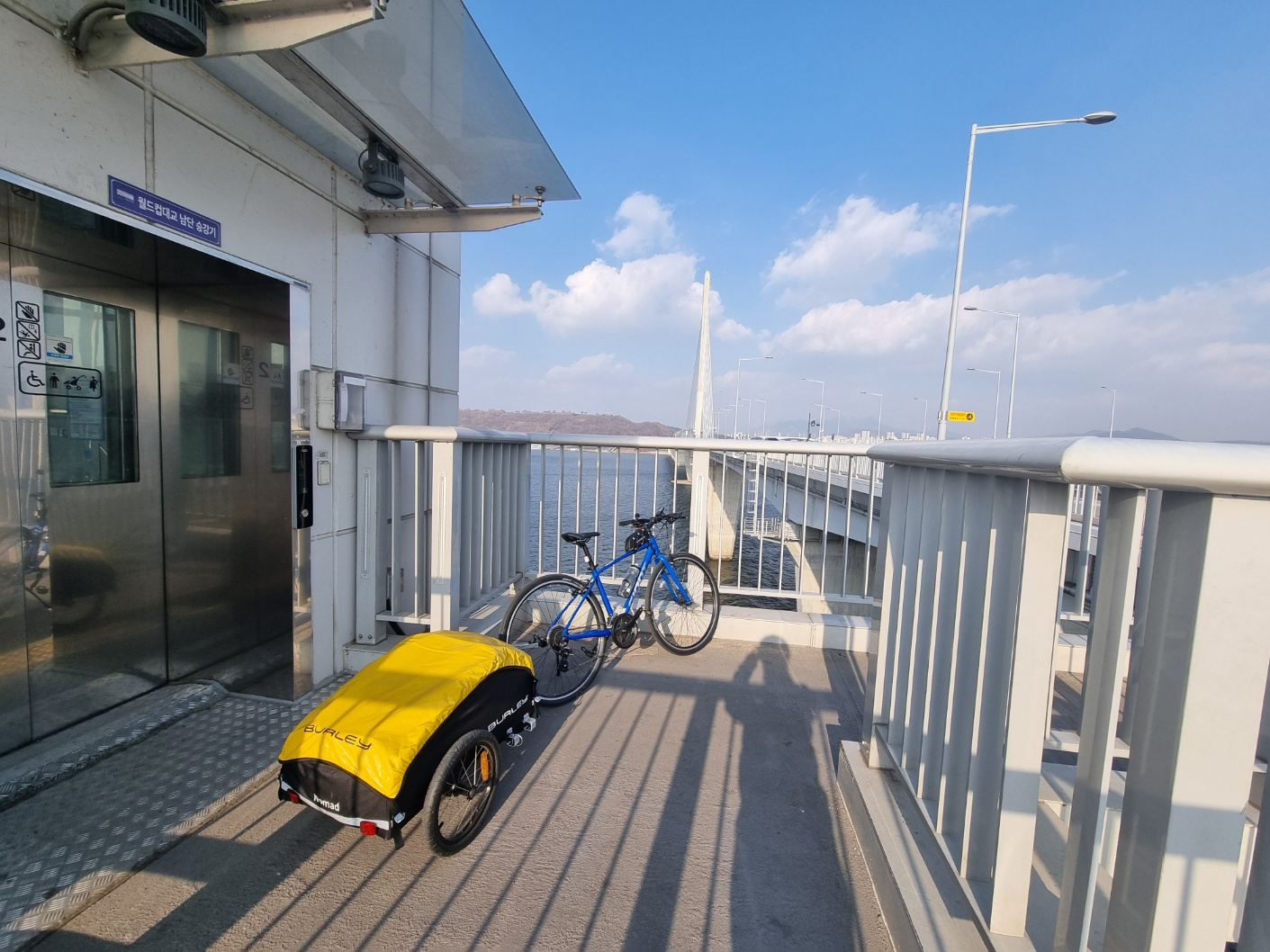 월드컵대교 엘리베이터는 엄청 크고, 문 닫히는 속도가 느려서 트레일러랑 같이 타기 너무 쾌적했다. 한강 인프라에 감사하는 마음... 트레일러를 분리하여 타면 된다