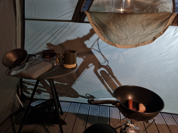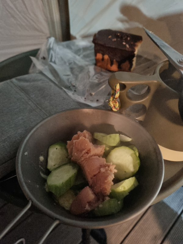 바지 두겹입고, 상체 우모복 입고 핫팩을 2개 터트리고 잤는데 한 개가 좀 일찍 꺼졌다. 살짝 한기를 느끼긴했으나 잠은 잘잤는데 핫팩이 꺼져서 그런거 아닐까