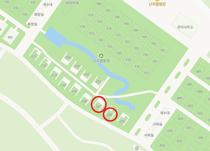 C5, C6, C7번 자리는 맞은편에 데크가 없어서 좀더 프라이빗한 느낌이 있지만 개수대나 화장실 등 거리가 적당해 명당이라 생각되었다.. 다만 C5는 길 옆이라 좀 아쉬워서 7/6번이 좋게 느껴졌다.