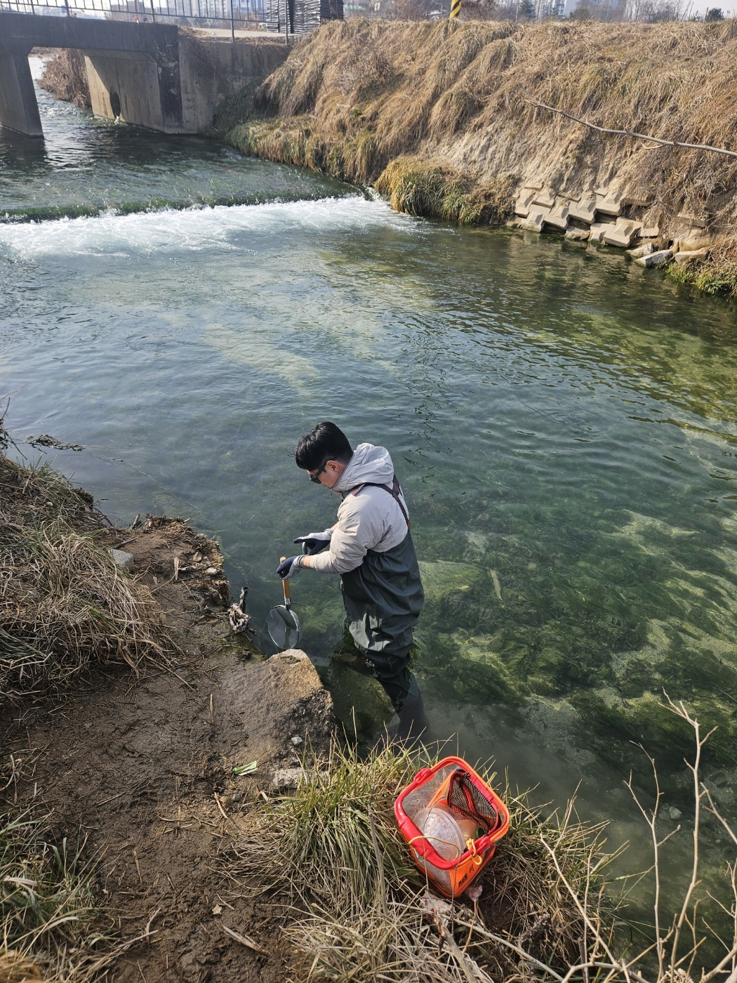물이 따듯해서 겨울인데도 가슴장화입고 채집에 어려움은 없었다. 수심은 무릎? 허벅지 정도 얕은 편이다.
