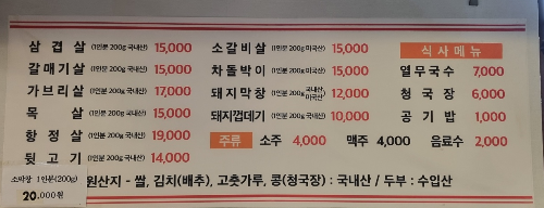 가격이 정말 저렴하다! 요새 200g 단위로 고기를 제공하는 가게가 많지 않은데 이렇게 많은 기본 반찬을 깔아주면서 1인분 200g에 15000원이라니 충격적인 가격이다. 이게 지방의 품격? 맥주 소주 가격도 저렴하다