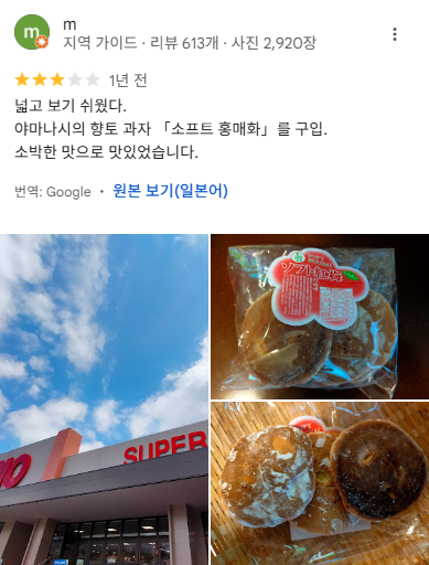 후모톳바라 캠핑장에서 18.6km 거리에 있고, 운전해서 20분 정도 걸린다. 다들 장을 많이 보는 이온 몰 슈퍼마켓(30분거리) 보다 훨씬 가깝고 더 고지에 있기 때문에 시내에서 오는 것이 아니거나, 장박할 경우 여기서 장보면 좋을 것 같다. 또한 8:30 체크인하여 좋은 자리를 잡기 위해 마트에 들리지 못한 분들도 여기서 장보면 좋을것이다!