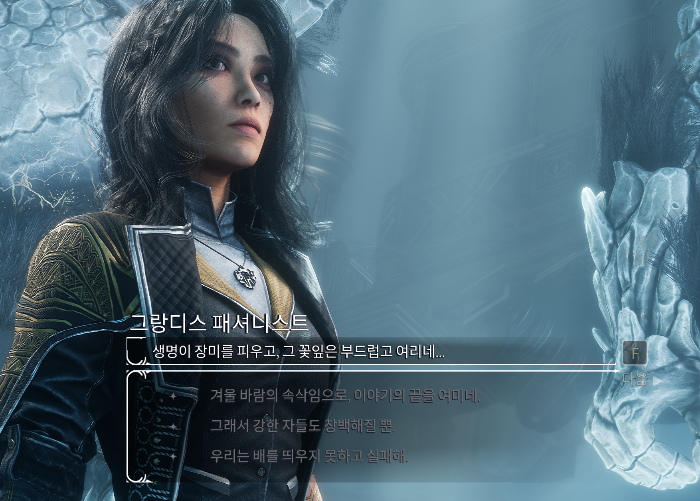 선택지 중 제일 긴 "겨울 바람의 속삭임으로, 이야기의 끝을 여미네"를 선택하자.