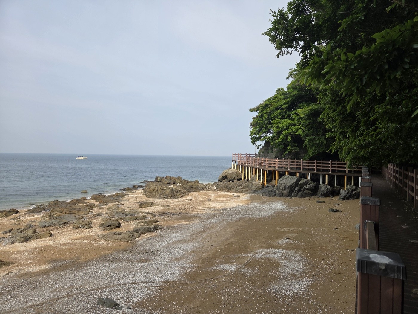 바다 밑이 모래 사장이라 바다 색이 너무 예뿌다. 그간 국화도 오면서 데크길 첨걸어봤는데 제법 마트까지 가깝다.