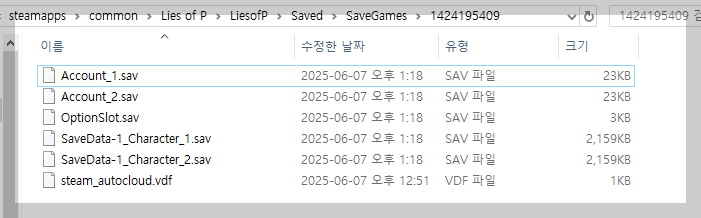 8. LiesofP폴더 > Saved > SaveGames > 숫자폴더 > 안에 세이브파일들이 있음