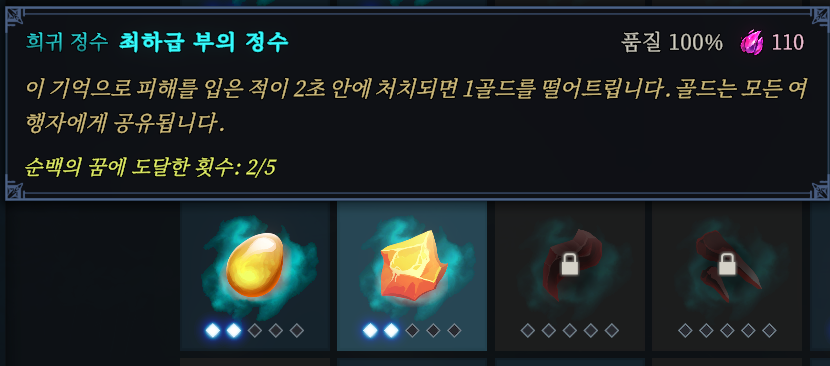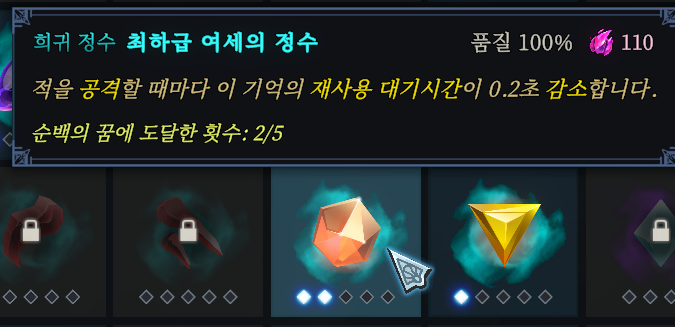 부의 정수: 이 기억으로 피해입은 적을 2초안에 죽일시, 골드를 준다. 쌀먹정수