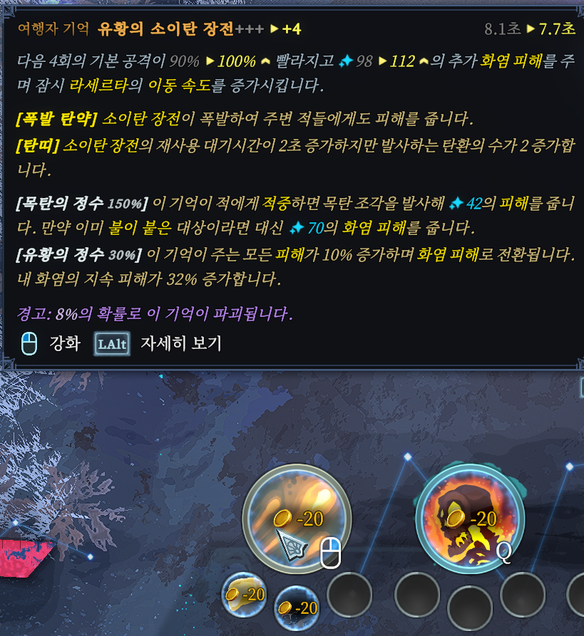 첫업글은 무료지만, 2번째 강화부터 8프로 > 16프로 확률로 기억이 터져 삭제될 확률이 높아진다.