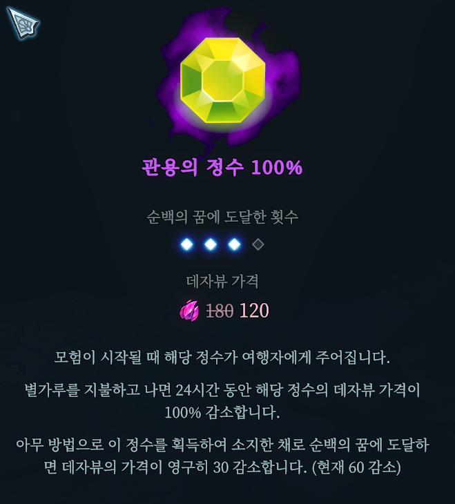 데자뷰는 여행자 레벨 총합이 50이 넘어가면 해금되는 기능으로, 별가루를 지급하여 특정 기억이나 정수를 1개만 24시간 동안 들고 시작할 수 있는 기능이다.
