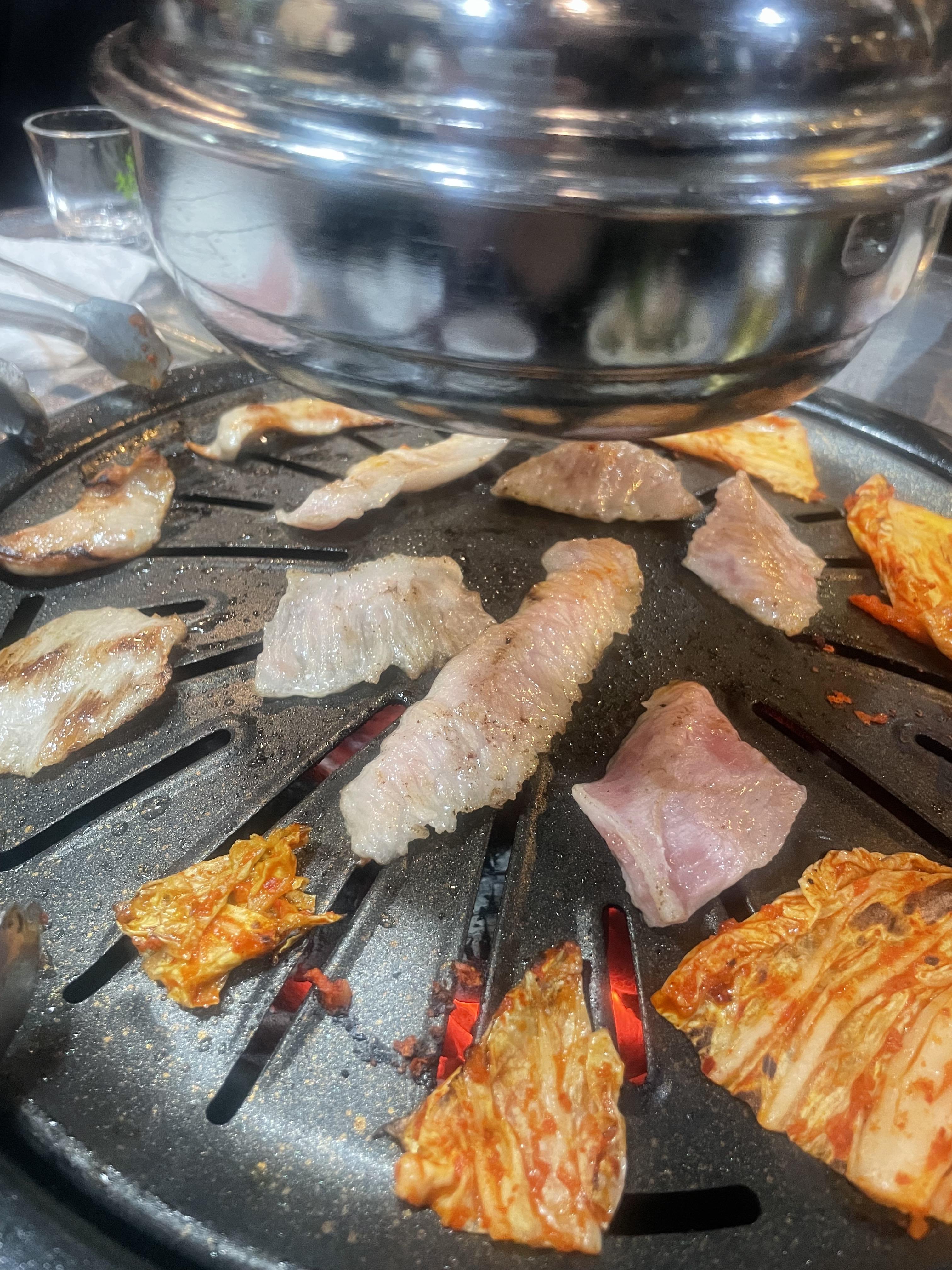 구운 김치랑, 고기랑, 절인 양파 삼합해서 먹으면 진짜 골든벨 뎅뎅울린다