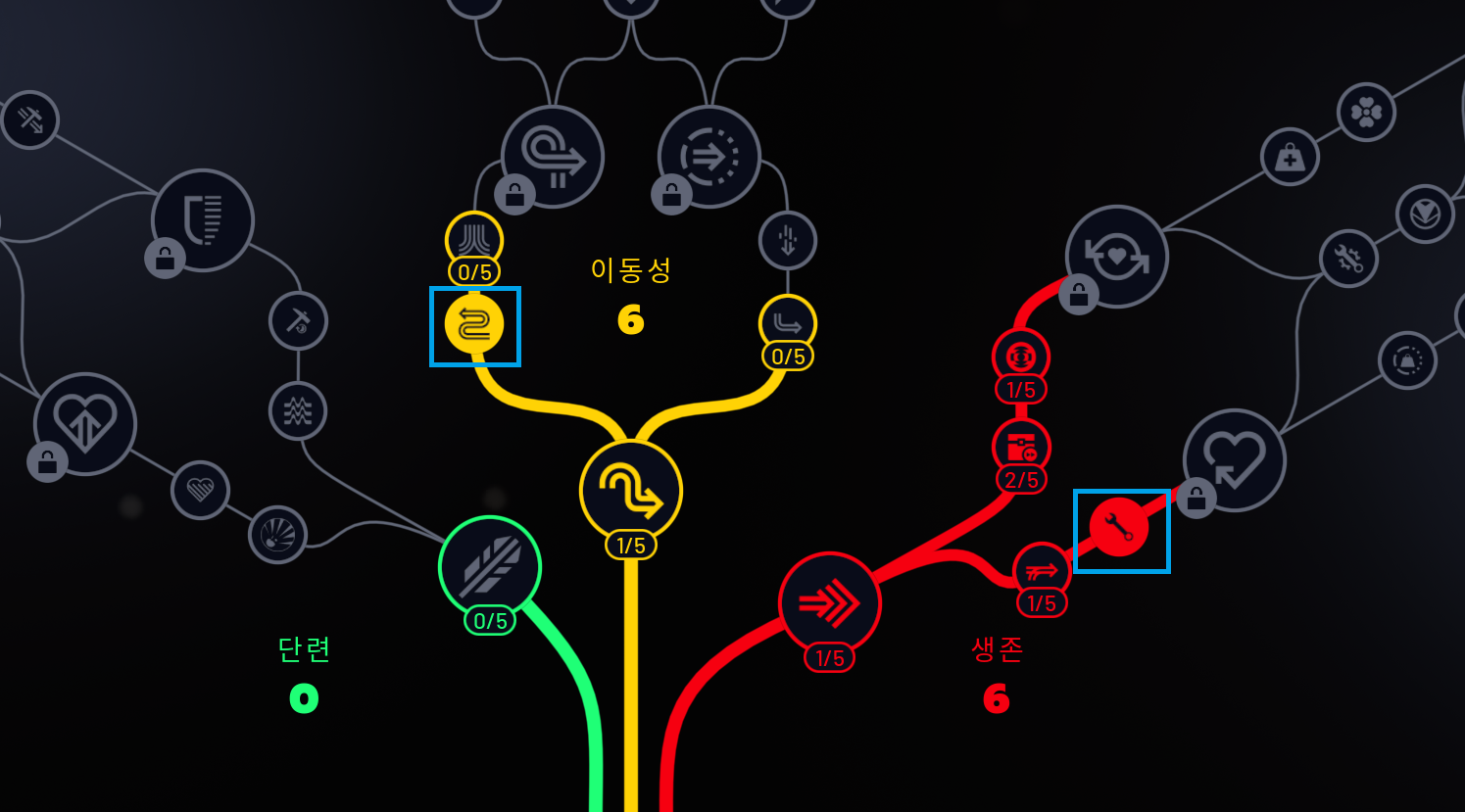 스킬 트리 중, 라운드 중 제작 (필드에서 아이템 제작 가능)과 달리기 스테미나부터 찍어주자