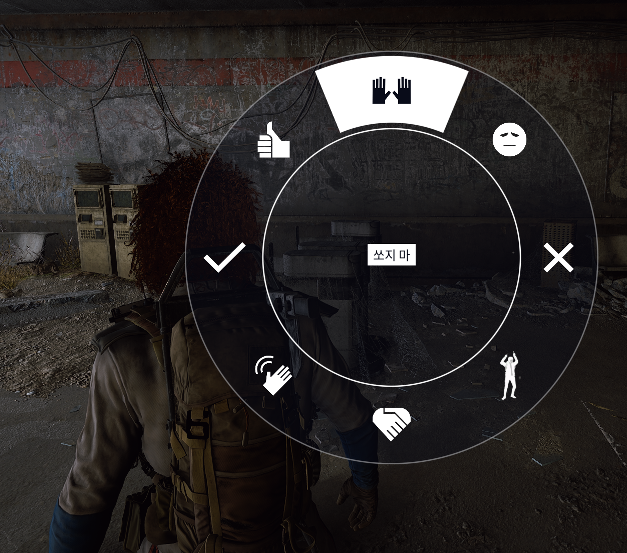 건물 안에서 사람소리가 들린다면 G를 누르면 나오는 감정표현 휠에서 쏘지마!를 외치고 다니자.