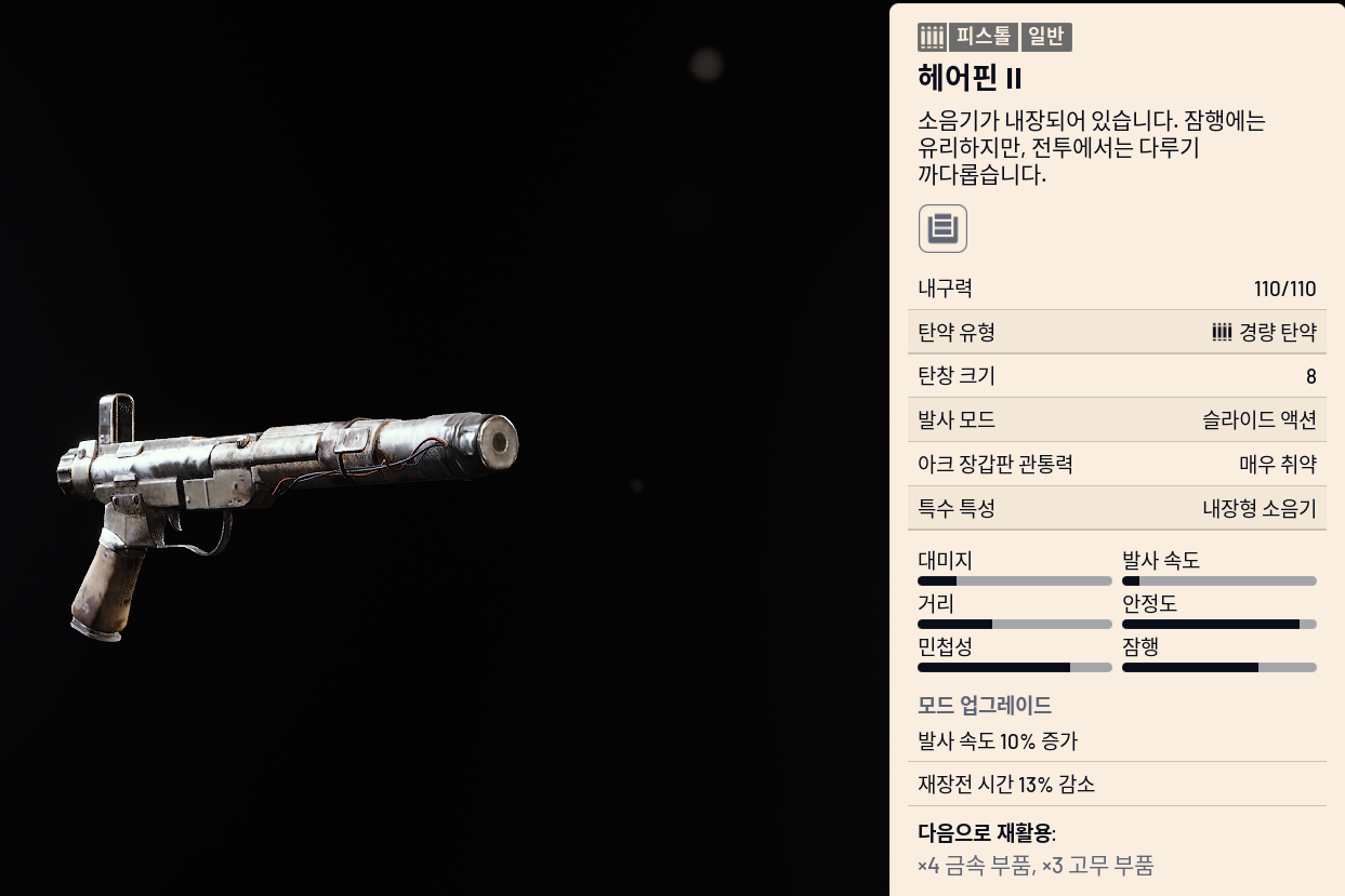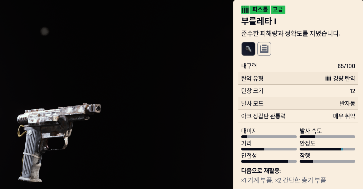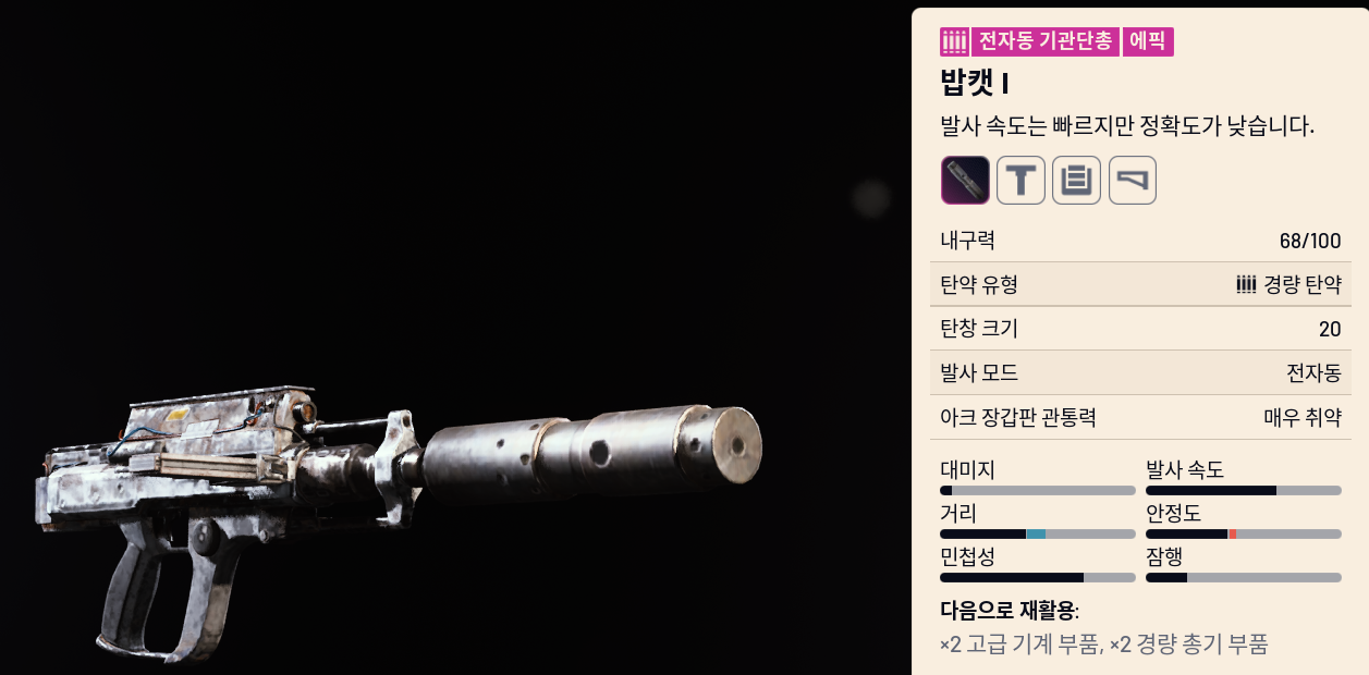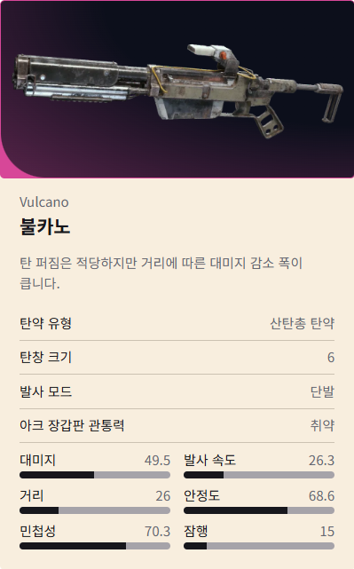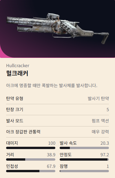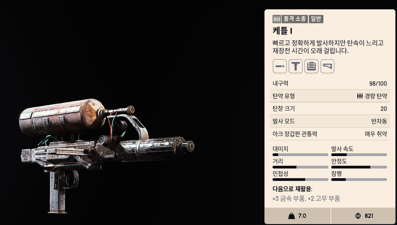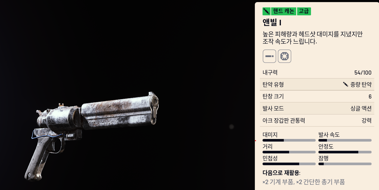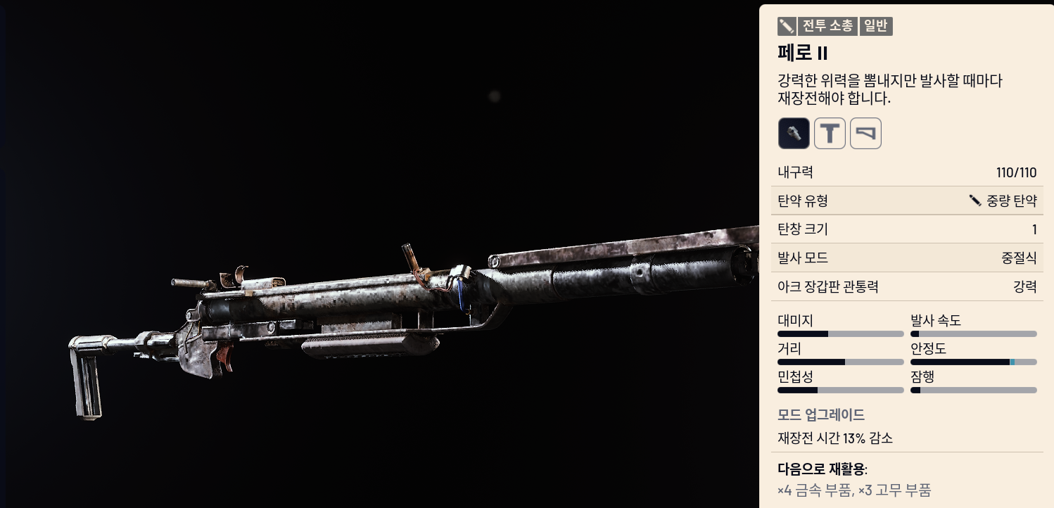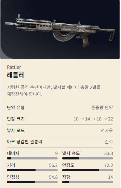 - 탄약: 런처 탄약, 펌프 액션