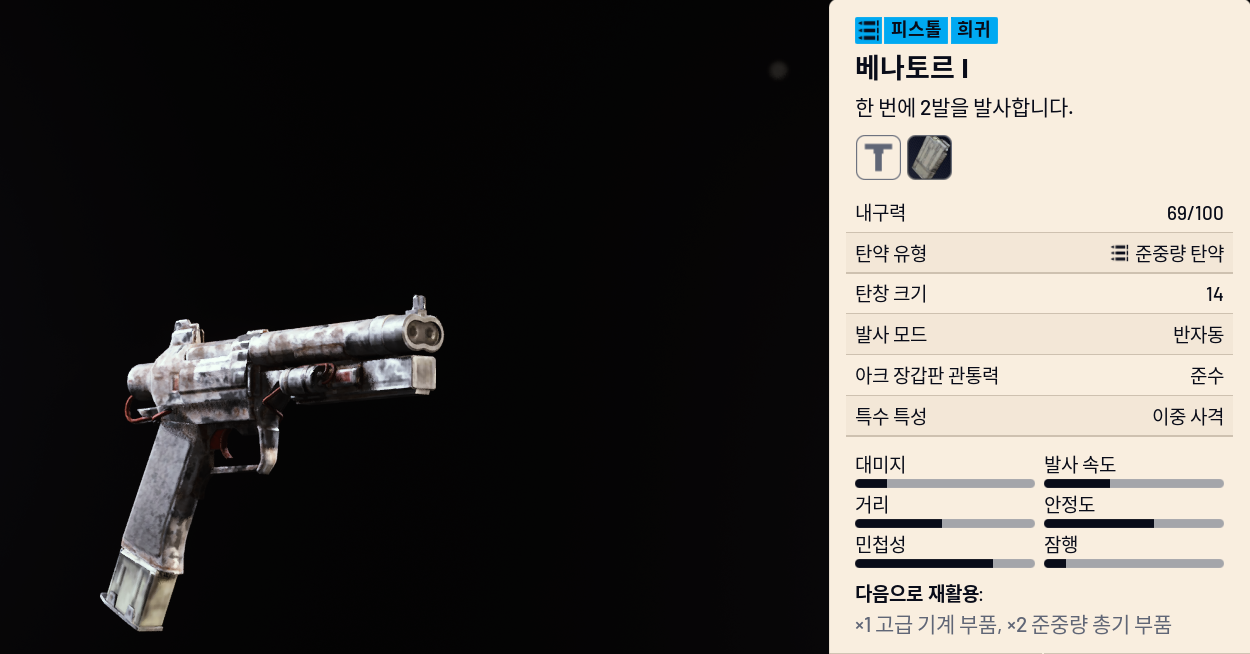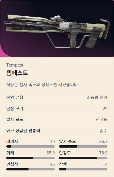 - 데미지: 9.5, 발사속도: 18.3, DPS: 173.9