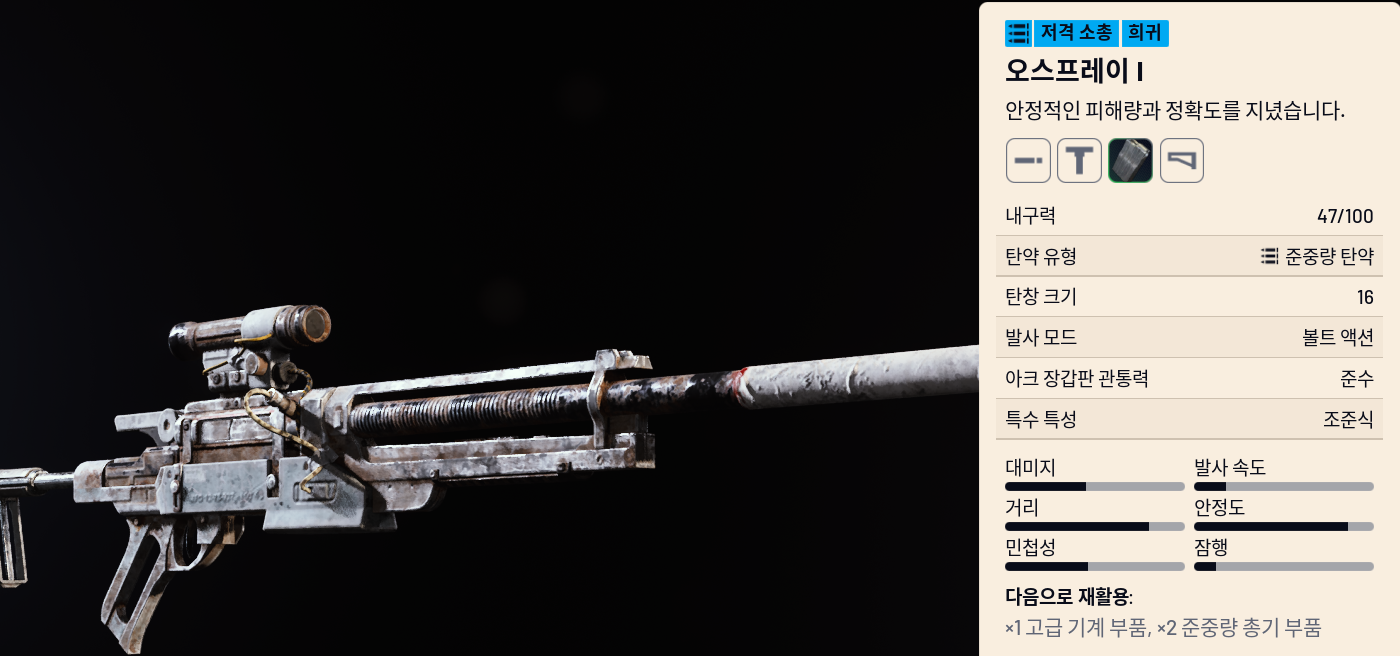 - 탄약: 준중량, 볼트 액션