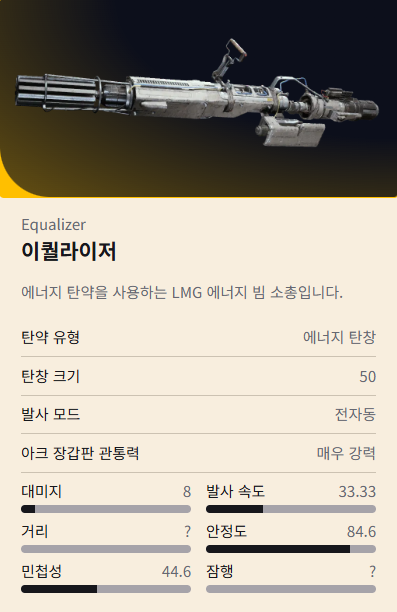- 데미지: 8, 발사속도: 58.3, DPS: 466.4