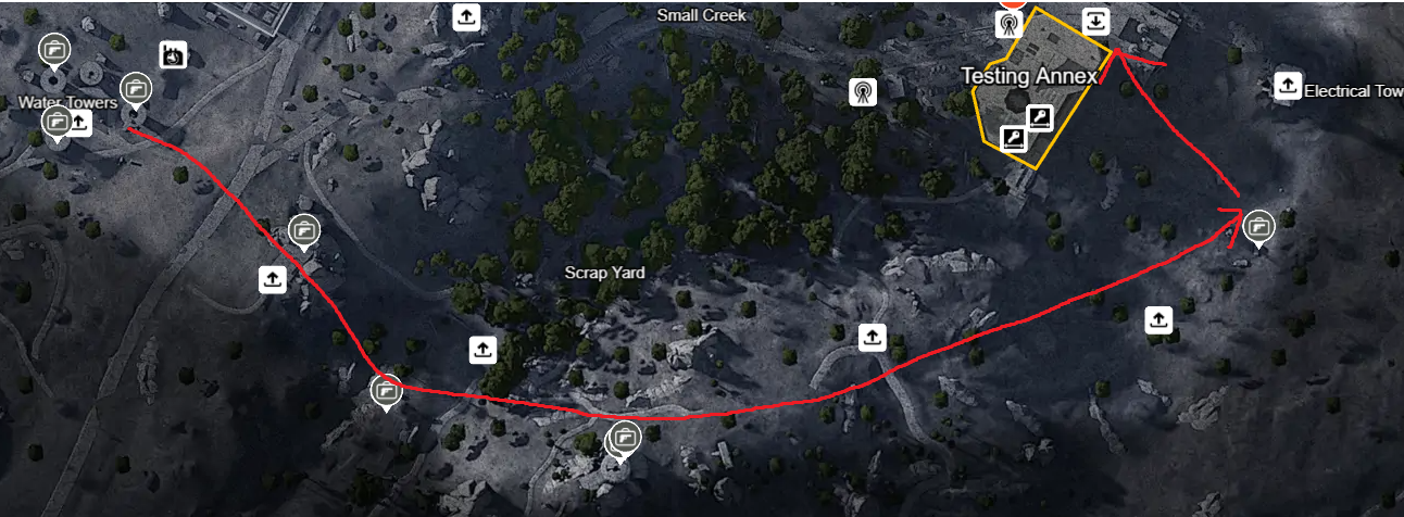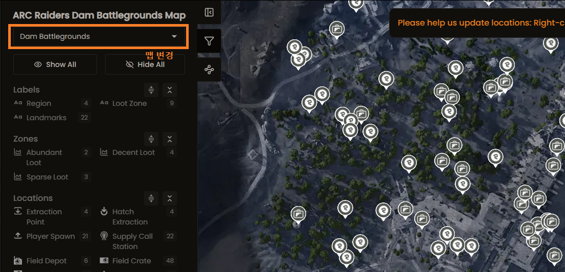 무기 상자를 체크하면, 아래 스크린 샷과 같이 무기 상자만 보인다. 아래 예시는 댐 전장인데, 스크린 샷과 같이 나만의 파밍 루트를 짜볼 수 있다.