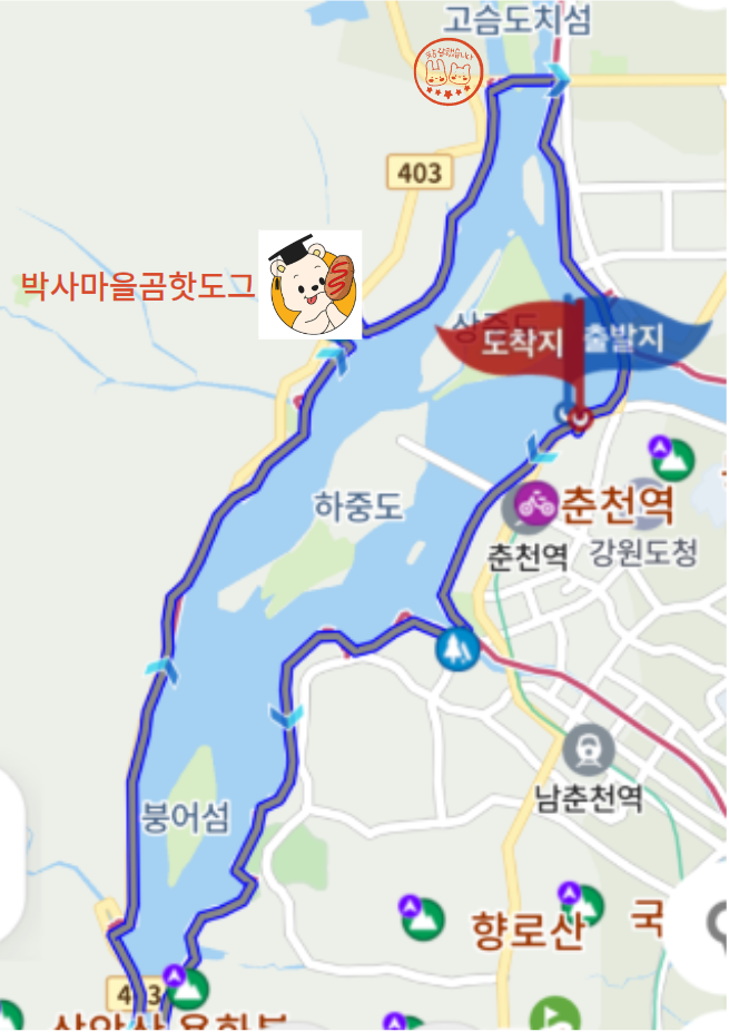 의암호 둘레길은 약 30KM 걸리는 코스로 쉬엄쉬엄 타도 2시간 정도면 탄다. 길의 업다운도 거의 없는 평지 코스인데 물가를 따라 길이 잘 조성되어 있어서 쾌적하게 아름다운 경치를 구경할 수 있다.