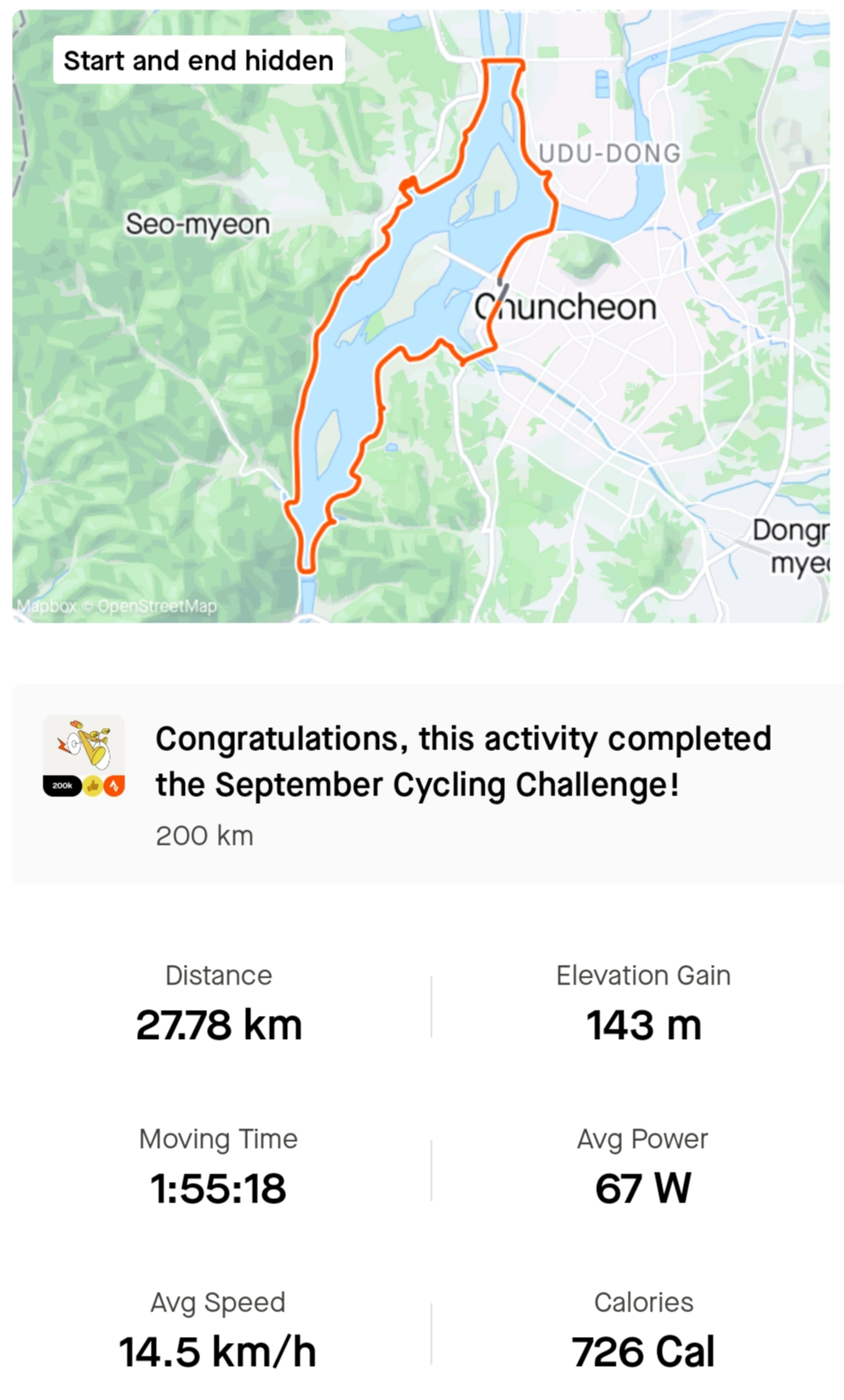 2023/9/29 춘천 의암호 둘레길로 자전거 라이딩했다
