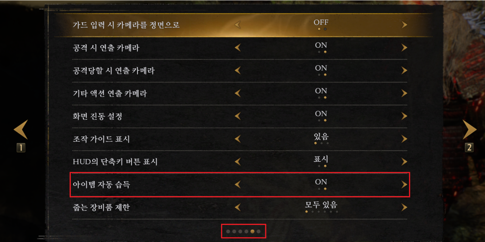 설정 > 게임설정 > 5번째 페이지 > 아이템 자동습득 on
