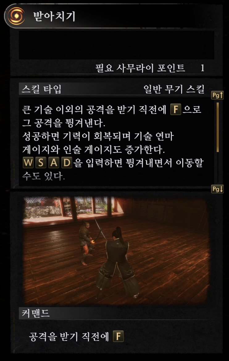사무라이 패링(받아치기)의 경우, 튜토리얼 보스를 잡은 이후에 획득 할 수 있습니다.