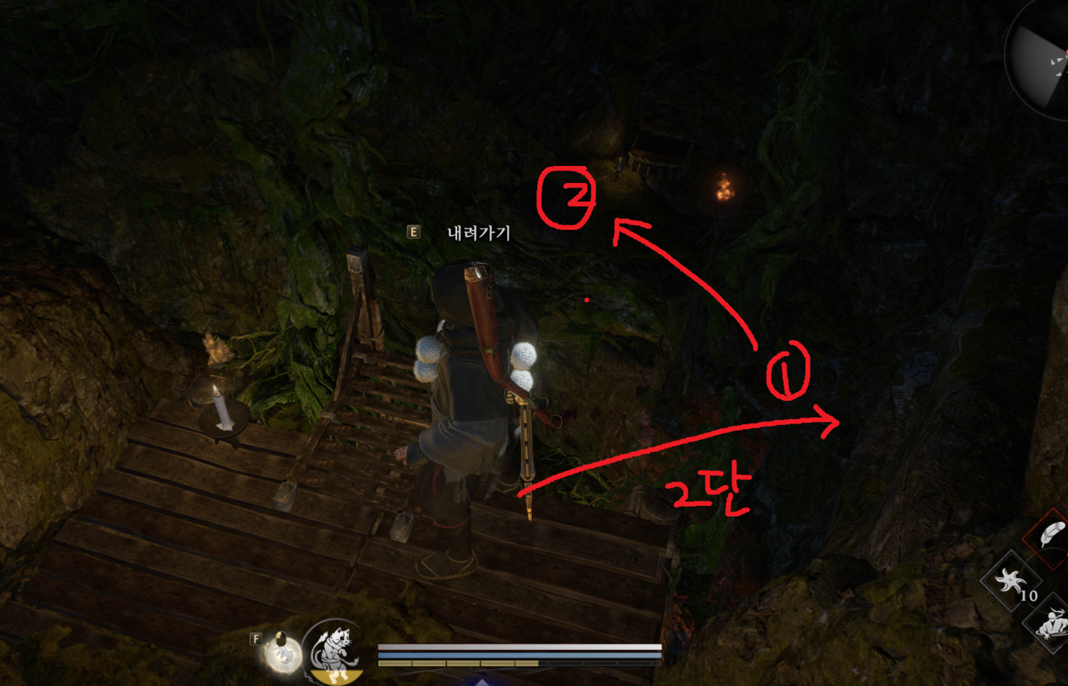 바닥에서 우측에 보면 사다리가 있는데, 사다리 한개만 올라갑시다.