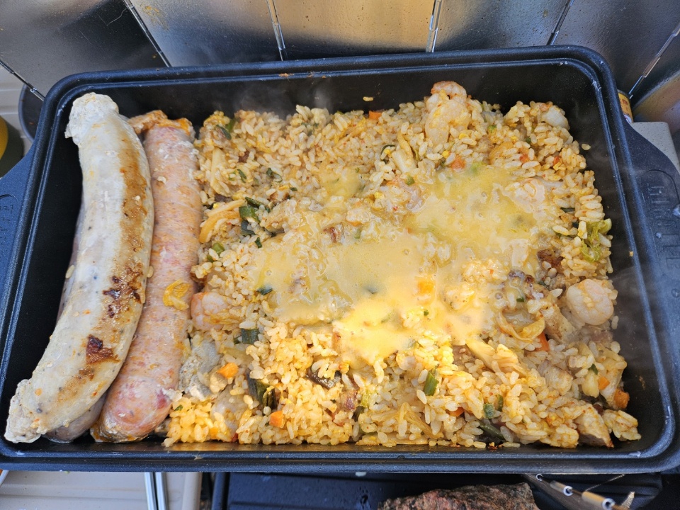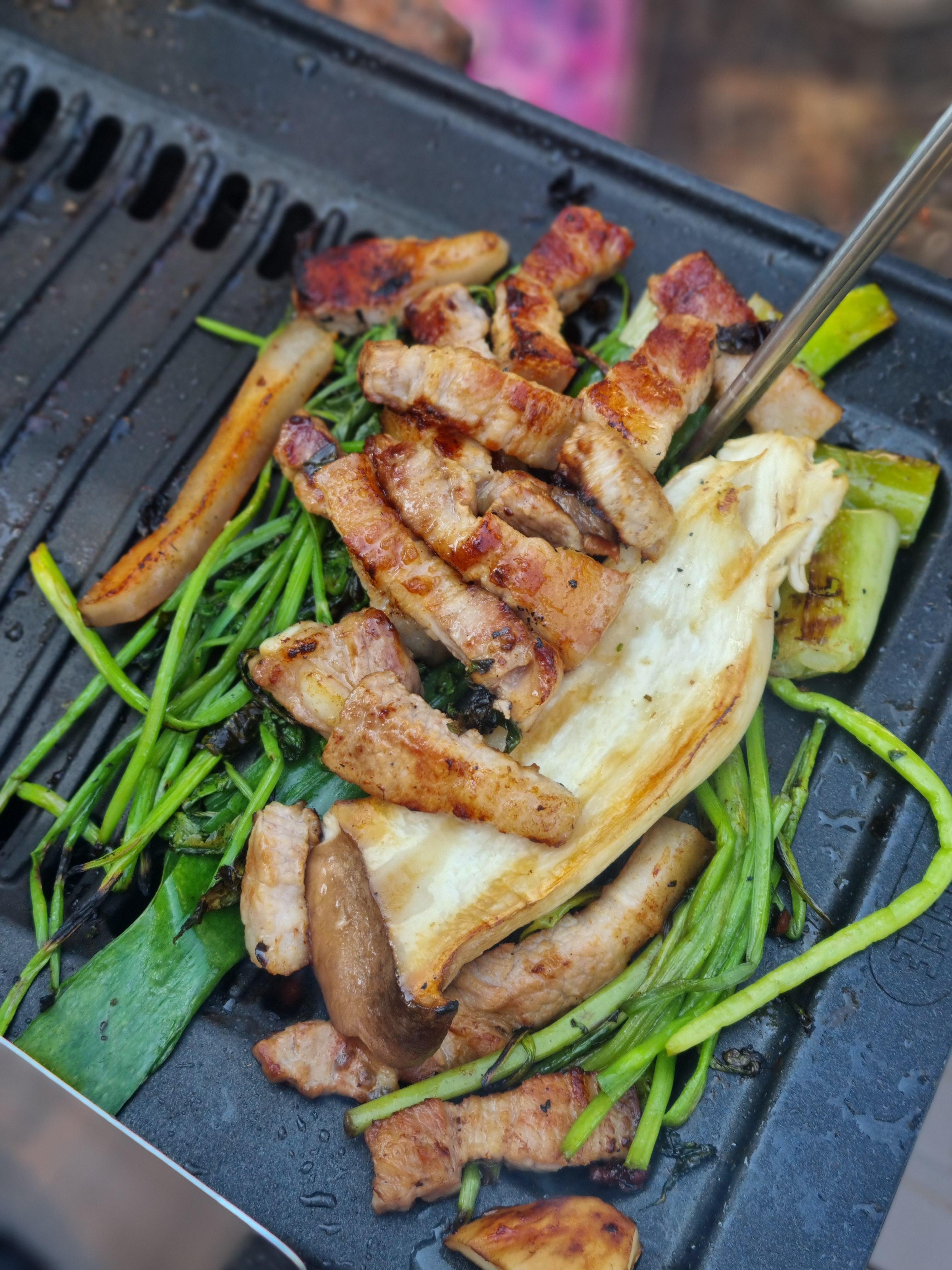 점심 삼겹살/볶음밥, 소세지, 저녁 부대찌개, 육회, 아침 보름달